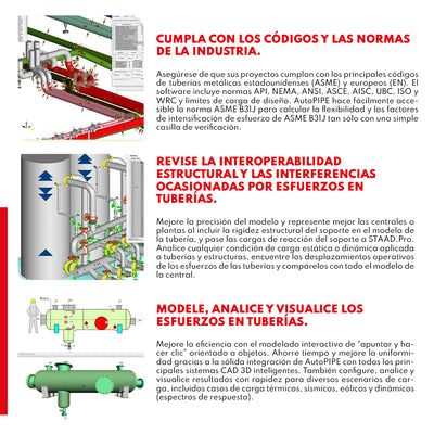 DESCRIPCIÓN AutoPIPE es una aplicación de análisis y diseño que se utiliza para calcular tensiones, cargas y deflexiones de tuberías en condiciones de carga estática y dinámica. Con una amplia interoperabilidad con otras aplicaciones de la industria, así como funciones que ahorran tiempo como el nuevo optimizador de soporte, AutoPIPE ayuda a garantizar diseños de calidad y rentables, y un flujo de trabajo sin problemas para los ingenieros que lo utilizan. Disponible en versión perpetua y suscripción anual Virtuosity. CARACTERÍSTICAS BENTLEY AutoPipe • Modele, analice y visualice los esfuerzos en tuberías Mejore la eficiencia con el modelado interactivo de "apuntar y hacer clic" orientado a objetos. Ahorre tiempo y mejore la uniformidad gracias a la sólida integración de AutoPIPE con todos los principales sistemas CAD 3D inteligentes. También configure, analice y visualice resultados con rapidez para diversos escenarios de carga, incluidos casos de carga térmicos, sísmicos, eólicos y dinámicos (espectros de respuesta). • Revise la interoperabilidad estructural y las interferencias ocasionadas por esfuerzos en tuberías Mejore la precisión del modelo y represente mejor las centrales o plantas al incluir la rigidez estructural del soporte en el modelo de la tubería, y pase las cargas de reacción del soporte a STAAD.Pro. Analice cualquier condición de carga estática o dinámica aplicada a tuberías y estructuras, encuentre los desplazamientos operativos de los esfuerzos de las tuberías y compárelos con todo el modelo de la central. • Cumpla con los códigos y las normas de la industria Asegúrese de que sus proyectos cumplan con los principales códigos de tuberías metálicas estadounidenses (ASME) y europeos (EN). El software incluye normas API, NEMA, ANSI, ASCE, AISC, UBC, ISO y WRC y límites de carga de diseño. AutoPIPE hace fácilmente accesible la norma ASME B31J para calcular la flexibilidad y los factores de intensificación de esfuerzo de ASME B31J tan sólo con una simple casilla de verificación. ESPECIFICACIONES ⨭ Ahorre tiempo con una aplicación fácil de usar ⨭ Realizar análisis y diseño avanzados ⨭ Crear resultados gráficos e informes ⨭ Optimice los flujos de trabajo multidisciplinarios ⨭ Optimizar los soportes de las tuberías VIDEOS DESCARGAS Descargar Datasheet