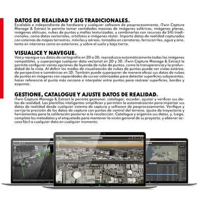 DESCRIPCIÓN iTwin Capture Manage & Extract le permite organizar, catalogar, verificar y ajustar sus datos de realidad, sin importar el tamaño o el tipo. Además, la aplicación de escritorio le permite realizar mediciones simples y complejas, extraer características y realizar análisis avanzados utilizando cualquier dato de realidad. Disponible en versión perpetua y suscripción anual Virtuosity CARACTERÍSTICAS BENTLEY iTwin Capture Manage & Extract • Datos de realidad y SIG tradicionales Escalable e independiente de hardware y cualquier software de posprocesamiento, iTwin Capture Manage & Extract le permite tomar cantidades masivas de imágenes esféricas, imágenes planas, imágenes oblicuas, nubes de puntos y mallas texturizadas, y combinarlas con recursos de SIG tradicionales, como datos vectoriales, ortofotos e imágenes ráster. Importe datos de realidad capturados con sistemas de mapas terrestres, móviles y aéreos, tomados en carreteras, ferrocarriles, agua y aire, tanto en interiores como en exteriores, y sobre el suelo y bajo tierra. • Visualice y navegue Vea y navegue sus datos de cartografía en 2D o 3D, reproduzca automáticamente todas las imágenes compatibles, y superponga cualquier dato vectorial en 2D y 3D. iTwin Capture Manage & Extract le permite configurar varias opciones de leyenda de nube de puntos, como la transparencia y la profundidad de la vista. Al definir los modos de visualización de nubes de puntos puede ver vistas estéreo, de perspectiva e isométricas en 3D. También puede superponer de manera eficaz sus datos de nubes de puntos en imágenes con capacidades de cursor colorizadas para detectar superficies subyacentes, hacer referencia al punto más cercano e interpolar entre puntos para rastrear superficies, bordes y esquinas. • Gestione, catalogue y ajuste datos de realidad iTwin Capture Manage & Extract le permite gestionar, catalogar, acceder, ajustar y verificar sus datos de realidad. Las plantillas inteligentes simplifican y permiten la automatización para importar sus datos de realidad desde cualquier sistema de captura y software de posprocesamiento. Verifique y corrija la precisión de los datos de captura con puntos de control del terreno, ajuste de trayectoria y herramientas para la calibración posterior a la recolección. Catalogue y organice sus datos, y, luego, complete los metadatos y el etiquetado para mantener la visión general de su proyecto, y obtener acceso fácil a cualquier dato en cualquier momento. • Extraiga activos y análisis avanzados iTwin Capture Manage & Extract le permite realizar mediciones simples y complejas, extraer características y realizar análisis avanzados. Puede realizar mediciones con cualquier dato de realidad y extraerlos en características SIG. Cree y verifique su inventario de activos. Realice mediciones manuales, semiautomatizadas y completamente automatizadas con datos de nubes de puntos, en combinación con flujos de trabajo orientados a objetos y análisis específicos de dominio, como distancia de puentes, detección de incompatibilidades, perfiles y secciones transversales, y análisis de baches de carreteras. • Trabajo en equipo con una base de datos centralizada Los operadores pueden trabajar de forma independiente o colaborar para convertirse en equipos eficientes de producción de características. Los directores de equipo pueden configurar su unidad de producción, importar datos de realidad, preparar el flujo de trabajo de extracción de características y gestionar espacios de trabajo para múltiples operadores. Los activos extraídos se pueden almacenar en la base de datos centralizada que proporciona ajustes en tiempo real para todos los operadores. Se pueden agregar o adjuntar metadatos adicionales, información de atributos, documentos y fotografías. Los procedimientos simples maximizan la productividad del operador. La actividad del equipo y los usuarios se registra para crear informes y obtener perspectivas para afinar su producción. ESPECIFICACIONES ⨭ Medir y extraer características de imágenes, nubes de puntos, mallas de realidad, dem y referencias vectoriales ⨭ Mediciones por nubes de puntos, mallas, dem, planos de referencia e intersección hacia adelante ⨭ Reconoce automáticamente puntos, superficies, crestas y esquinas. ⨭ Aplicar mediciones asistidas y automatizadas ⨭ Utilice herramientas avanzadas para la extracción de características de datos de nubes de puntos ⨭ Genere flujos de trabajo de extracción de características rápidos y eficientes ⨭ Generar y exportar perfiles y secciones transversales ⨭ Detección automática de postes y señales de tráfico ⨭ Crear planos de planta en 2D ⨭ Calcular y reportar volúmenes 2.5D ⨭ Caja de herramientas de datos vectoriales SIG ⨭ Guardar mediciones en GIS y exportarlas a CAD VIDEOS DESCARGAS Descargar Datasheet
