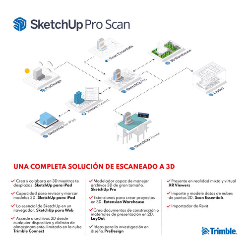 DESCRIPCIÓN SketchUp Pro Scan es la forma más accesible de trabajar con nubes de puntos en 3D. Con aplicaciones intuitivas 3D y 2D que funcionan con nubes de puntos, Pro Scan le ayuda a convertir los datos escaneados en visualizaciones dimensionales claras que todos puedan entender. Sólo para Windows. BENEFICIOS PRO SCAN Integración de nube de puntos Importe escaneos terrestres, fotogrametría, sensores LiDAR, mapeo móvil y capturas de drones como nubes de puntos y visualícelos en 3D. Modelado 3D intuitivo Modele con precisión sobre nubes de puntos utilizando las sencillas herramientas nativas de SketchUp. Cree modelos 3D precisos para proyectos profesionales. Modelador móvil Dibuje, edite y marque modelos 3D directamente en su iPad. Cree y colabore en 3D en la obra, oficina o sobre la marcha. Documentación 2D Dibuje, edite y marque modelos 3D directamente en su iPad. Cree y colabore en 3D en la obra, oficina o sobre la marcha. Colaboración en la nube Vincule datos de más de 60 herramientas de la industria y comparta los conjuntos de datos más recientes para que los proyectos se ejecuten según el calendario y el presupuesto previstos. Aplicaciones de visualización AR/VR Sumerja a los clientes en diseños 3D a escala 1:1 o en modo de sobremesa mediante aplicaciones de visualización de realidad mixta y realidad virtual. ESPECIFICACIONES ⨭ Crea y colabora en 3D mientras te desplazas (SketchUp para iPad) ⨭ Capacidad para revisar y marcar modelos 3D (SketchUp para iPad) ⨭ Lo esencial de SketchUp en un navegador (SketchUp para Web) ⨭ Accede a archivos 3D desde cualquier dispositivo y disfruta de almacenamiento ilimitado en la nube (Trimble Connect) ⨭ Modelador capaz de manejar archivos 3D de gran tamaño (SketchUp Pro) ⨭ Extensiones para crear proyectos en 3D (Extension Warehouse) ⨭ Crea documentos de construcción o materiales de presentación en 2D (LayOut) ⨭ Ideas para la investigación en diseño (PreDesign) ⨭ Presente en realidad mixta y virtual (XR Viewers) ⨭ Importe y modele datos de nubes de puntos 3D (Scan Essentials) ⨭ Importador de Revit VIDEOS DESCARGAS DESCARGAR DATASHEET